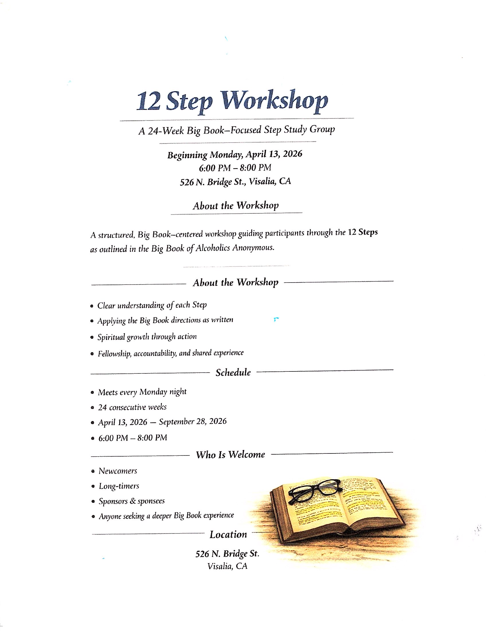 A structured, Big Book—centered workshop guiding participants through the 12 Steps as outlined in the Big Book of Alcoholics Anonymous.